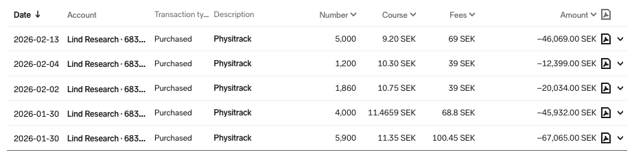 Action: Lately, we have been buying PTRK and posting it to our premium members. Our first purchase was around 11 SEK; since then, the price has continued to decline, with no clear explanation beyond a market meltdown related to SaaS. We bought more when the share price approached SEK 9. Current GAV at SEK 10.66, and it stands for 14.2% of the portfolio. Overall, we believe this is the right sizing given the significant value opportunity we see.