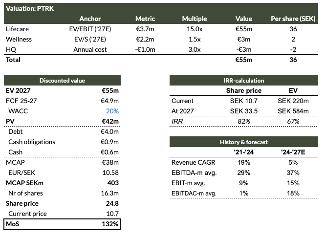 We believe PTRK's intrinsic value is in the range of 22-25 SEK and will continue to grow over the coming years. Our valuation is based on a simple SOTP, where almost all value is ascribed to Lifecare. We value Lifecare at a 15x multiple on our 2027E EBIT estimate, then discount the value to today at a 20% WACC. A valuation is never an exact science, but we can firmly state that PTRK is significantly undervalued at current levels.