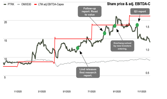 Since our initial research report, the case has become considerably less risky. PTRK has carried out most of the value-adding steps we suggested, yet the share price has fallen back to its pre-coverage levels. As a result, we see a very favorable risk-reward profile at present. The main risk remains if the Nordic micro- and small-cap sector continues to decline, potentially delaying market revaluation.