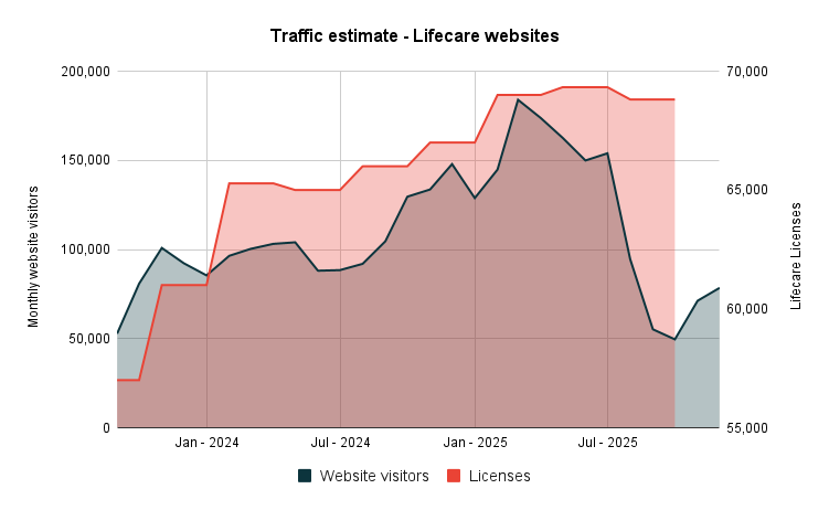 Licenses’ growth within Lifecare was mainly flat during the quarter, something we think warrants a closer look. We think the main site was affected by the Google core update in June, as our website visitor estimates decreased sharply.