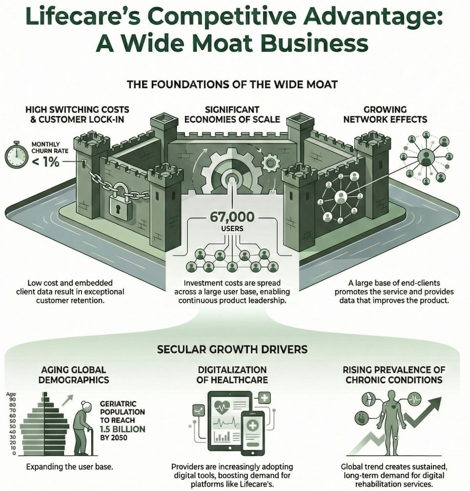 We view Lifecare as a wide-moat business. Physiotherapists, Chiropractors, and other licensed users rely on Physitrack platforms to run almost all their customer interactions.