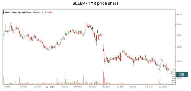 Sleep Cycle's share price saw a sharp decline following the release of disappointing Q1 and Q2 reports. It is now trading close to its 52-week low. And about 30% below its 52-week high. As shown in the chart, the most significant decline occurred during the past year, following the release of the Q1’25 report, and has since then continued.